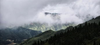 山叠翠,云弥漫,远处的风车若隐若现,阳光透过云层洒落山涧,瞬间被治愈。
