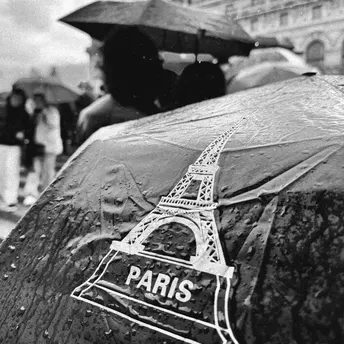 排队进奥赛博物馆,突然下起雨,前面的情侣撑起一把印有巴黎铁塔的雨伞