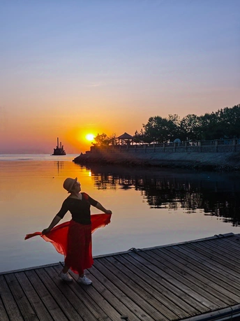 暮色染天边,余晖洒湖面。我立于栈桥上,红纱裙在风中轻扬,似要与这黄昏共舞。落日熔金,水影潋滟,远处的船、岸边的亭,都成了这幕景的配角。尘世喧嚣被隔绝,此刻,只愿沉醉在这温柔的黄昏里,让心灵随裙摆舞动,拥抱独属于我的静谧时光 。