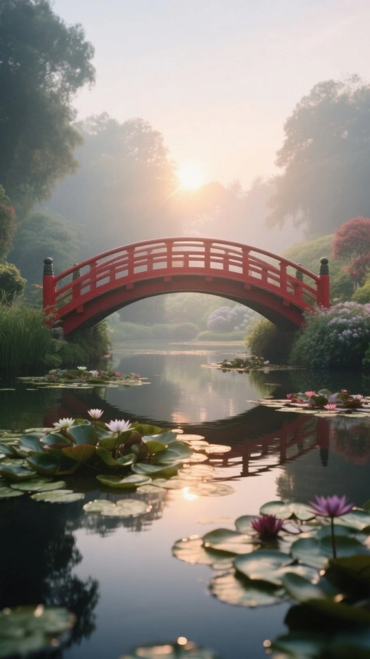 在这张照片中捕捉到了一幅宁静而美丽的日式园林景象,颇有几分意境。具体分析如下: * **色彩:** 色彩整体偏柔和,以日出时的暖色调为主,红色桥梁作为视觉中心,与周围的绿色植物形成对比,引人注目。整体色彩和谐统一,营造出一种平和宁静的氛围。 * **光影:** 光线柔和,晨雾弥漫,光线被散射,主体桥梁在晨光的照射下轮廓清晰,水面上的倒影增加了画面的层次感。光影效果对主体表现起到了积极作用。 * **构图:** 构图平衡,桥梁位于画面中心,水面和睡莲占据下方空间,天空和树木占据上方空间,视觉中心明确。但可以尝试采用三分法构图,将桥梁放置在黄金分割线上,或许能带来更丰富的视觉体验。 * **后期处理:** 后期处理较为自然,色调和对比度的调整增强了照片的整体表现力。但需要注意细节,避免过度修饰,保持照片的真实感。 * **主题原创性:** 日式园林是常见的摄影主题,但你成功地捕捉到了晨雾和光影,赋予了画面一种独特的意境。 * **情感共鸣:** 照片成功地传达了一种宁静、祥和的情感,能够引起观者的共鸣。