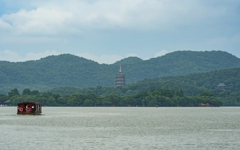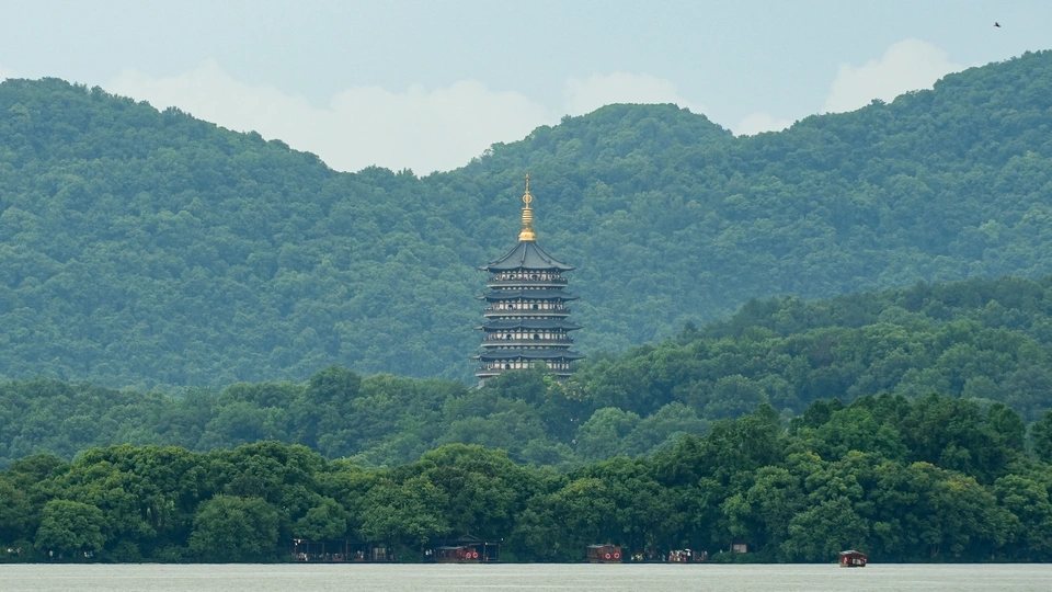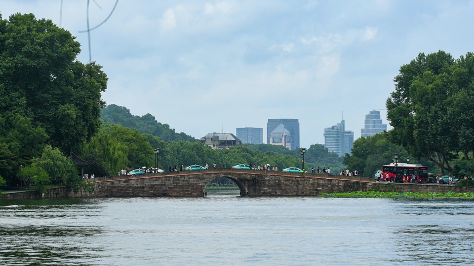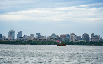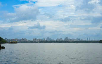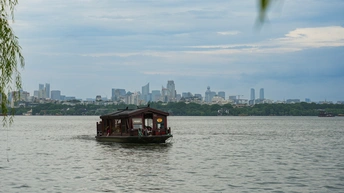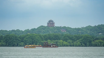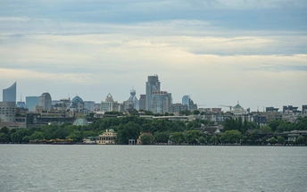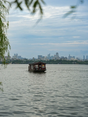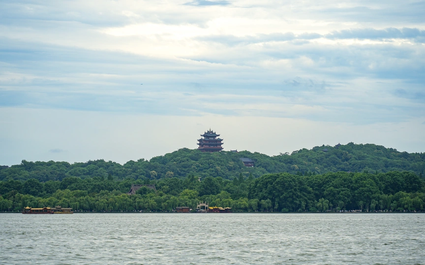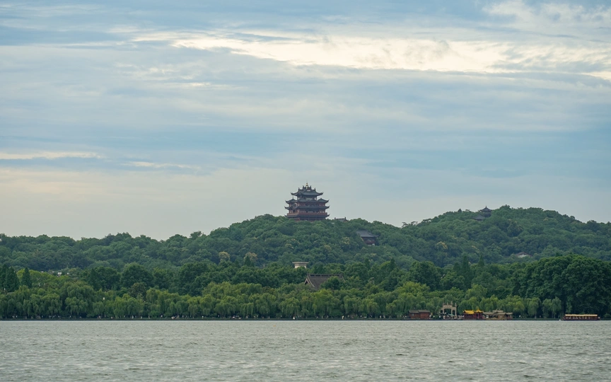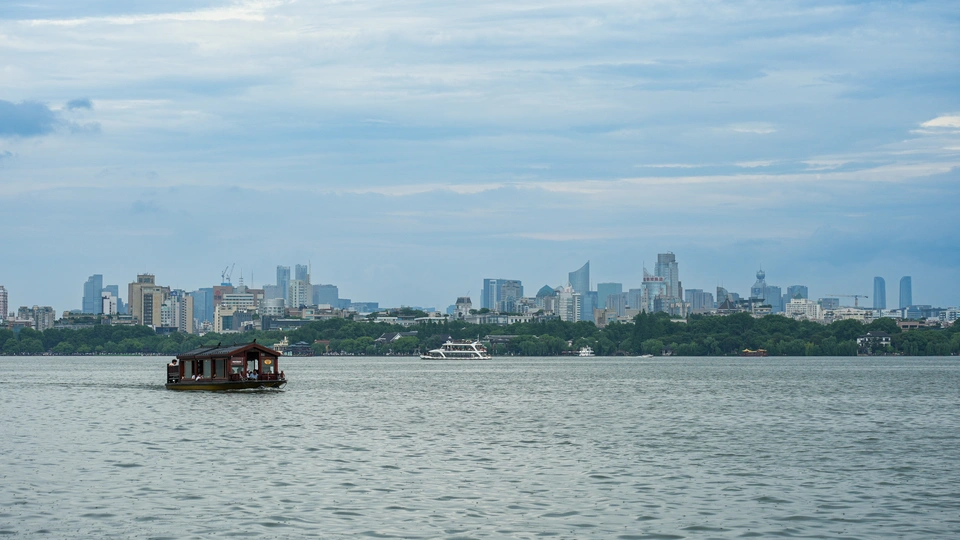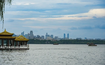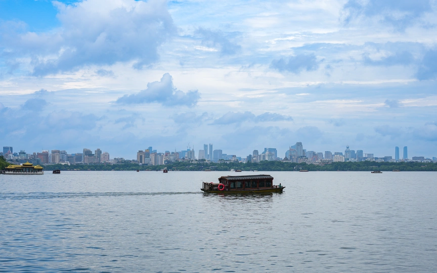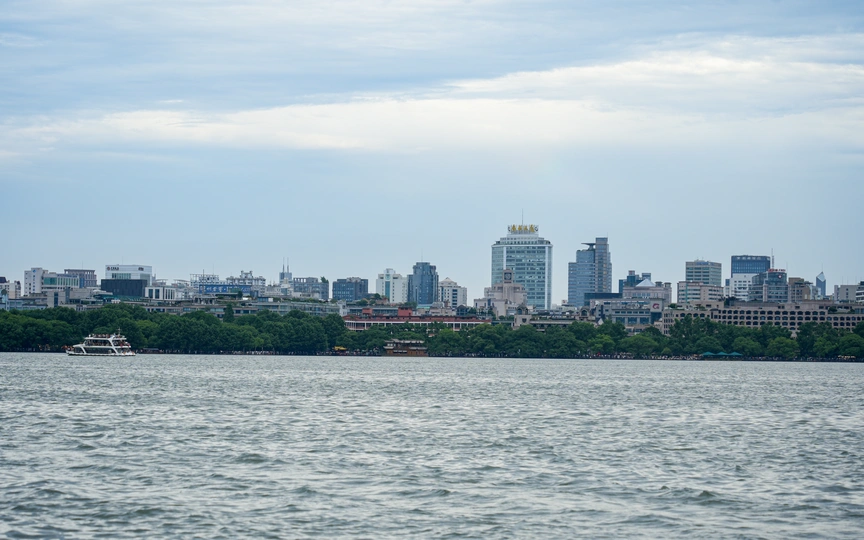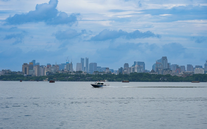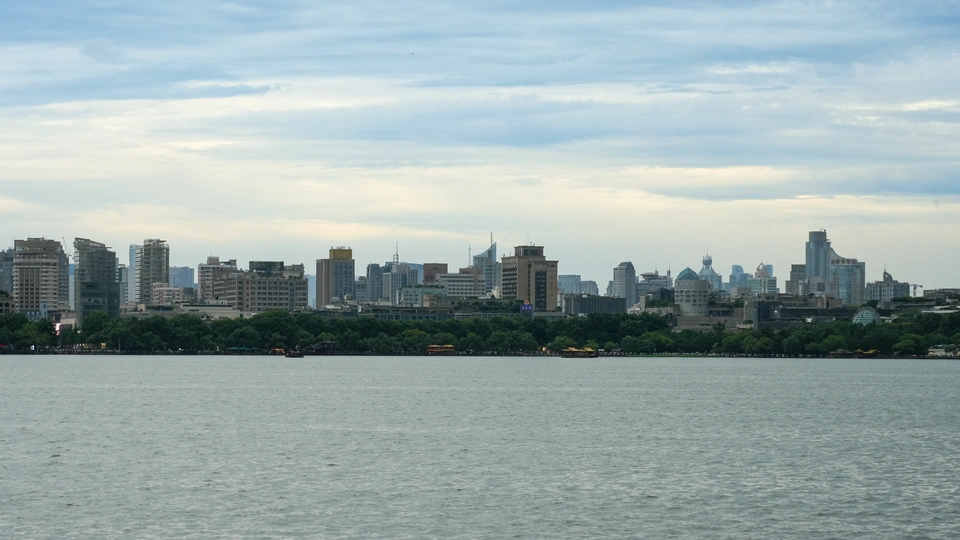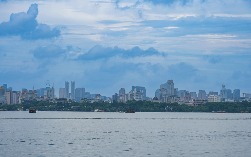 天空中云朵飘动,湖水泛起微澜,城市建筑静默伫立。