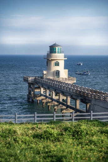 站在南澳岛的海岸线,穿越绿草如茵的山坡,尽头是一座凝望大海的灯塔。 它静默地伫立着,像是在等候一场迟来的告白,或是一艘归航的渔船。 风从海面吹来,卷起些许思念。阳光洒在波光粼粼的海面,连同那一段通向灯塔的长桥,都仿佛通往内心最柔软的地方。 这不仅是地理的尽头,更是诗意的起点。