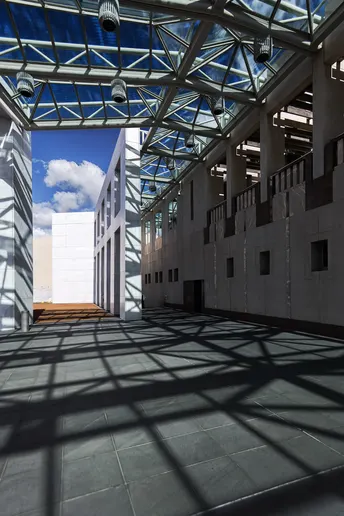在澳大利亚议会大厦门前,阳光透过上方的玻璃穹顶与金属构架,巧妙地在地面勾勒出几何光影图案。洁白的墙体与深灰色的地砖相互映衬,简洁而庄重。 远处,蓝天白云仿佛是一幅自然的画卷,与建筑内景形成鲜明对比。光影随着时间缓缓移动,似在诉说着时光的流转,也为这座庄严的建筑增添了几分灵动与诗意。这里,不仅是政治活动的前沿阵地,更是建筑美学与自然光线完美融合的典范,每一道光影都在无声地讲述着议会大厦的故事。