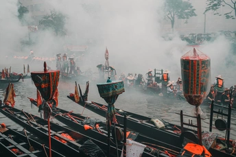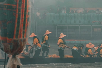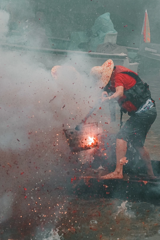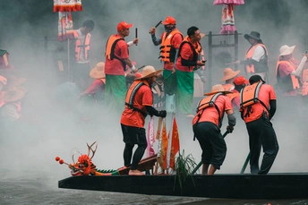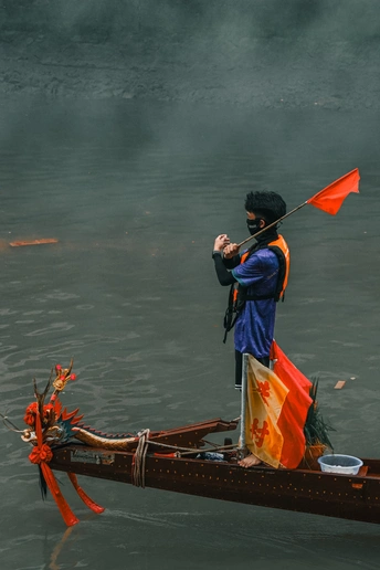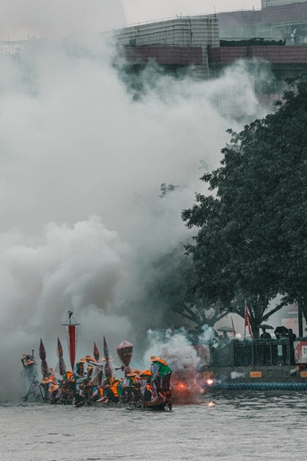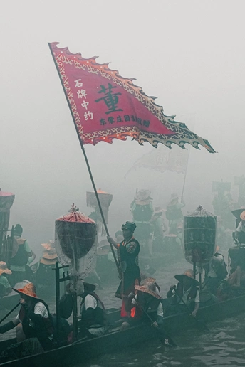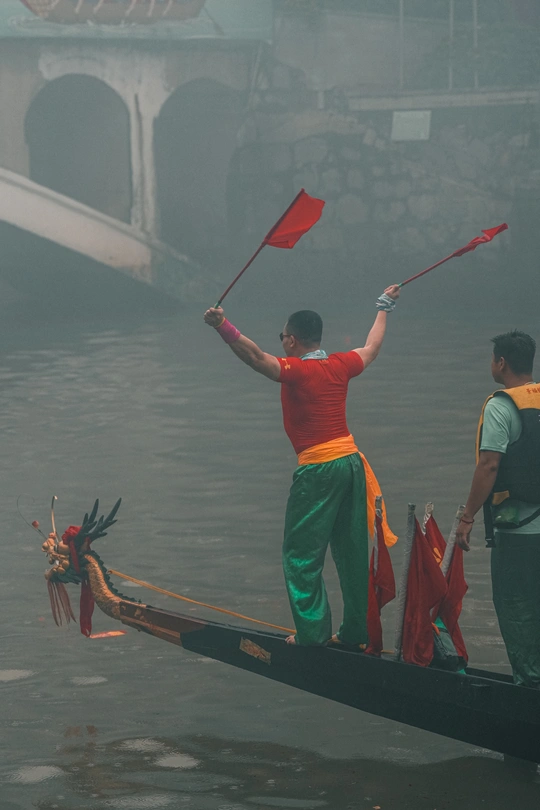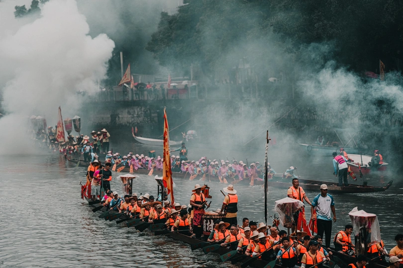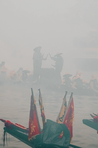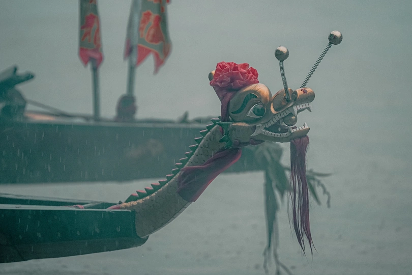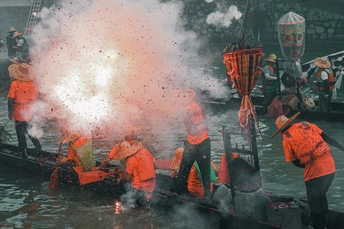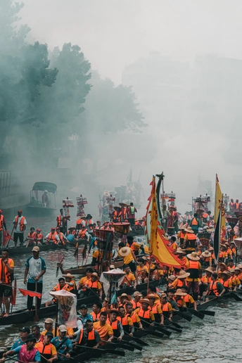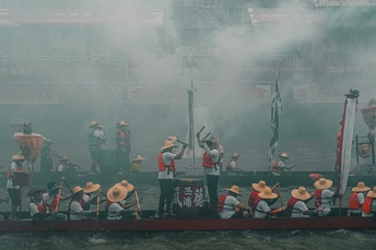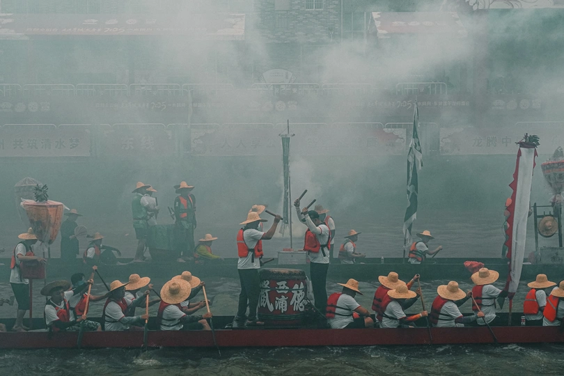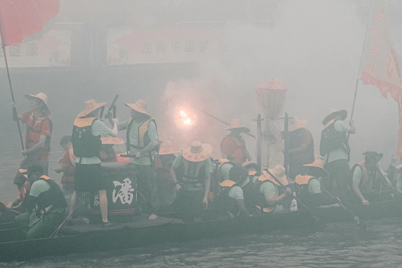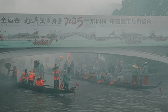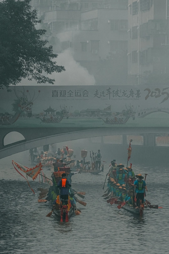 “五月三,招景聚龙溪。”天河区车陂村举行盛大招景活动,坊间素有“未踏车陂龙舟地,莫提睇过龙舟景”的美誉。200多艘来自天河、海珠、番禺、黄埔等地的龙舟前来趁景。车陂龙舟景迄今为止已经有三百多年的历史,被誉为广州最大的龙舟景,现更成为广东省第八批省级非物质文化遗产代表性项目。龙舟景是端午节龙舟的“探亲”活动,各村龙舟都会亮出各自特点,以龙舟装饰、服装及技艺“争奇斗艳”。车陂招景现场,色泽富丽的广绣罗伞,独具氏族特色的彩旗,精心装饰过的龙头龙尾,来自各村的兄弟老表在车陂涌上“以龙会友”。一时间,河涌、两岸锣鼓喧天,鞭炮轰鸣,热闹程度堪比过年!今天尽管有雨,但龙船热度丝毫不减,河涌两岸人山人海,河涌上游龙嬉戏、锣鼓喧天、爆竹声声,龙船招展各自的旗帜、罗伞,“扒仔”们或是齐声吆喝,或是挥舞大旗,时而向观众席抛掷鞭炮以示好,水上和岸边互动氛围热烈。此时此刻,鞭炮声、锣鼓声不断,群龙聚首来回游弋,场面盛大壮观。