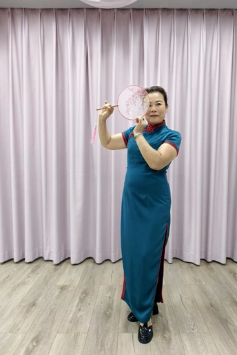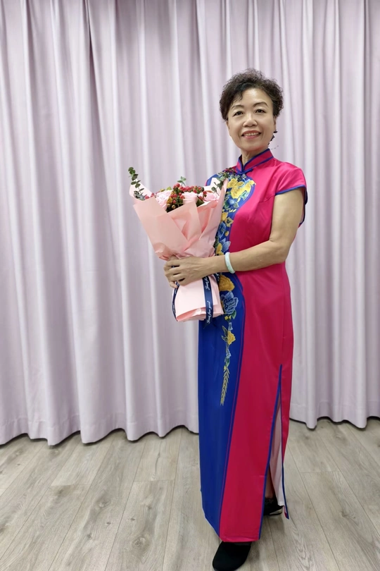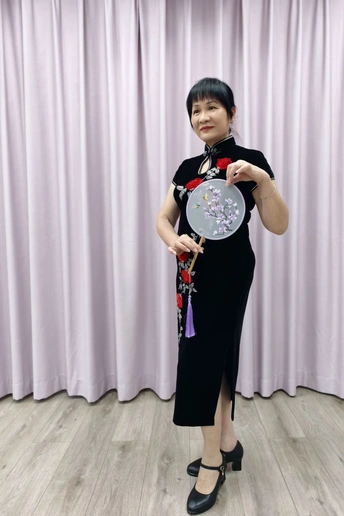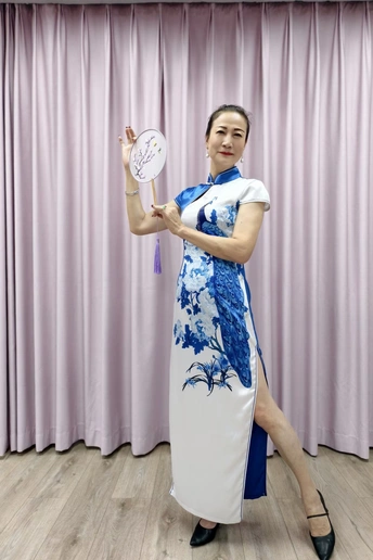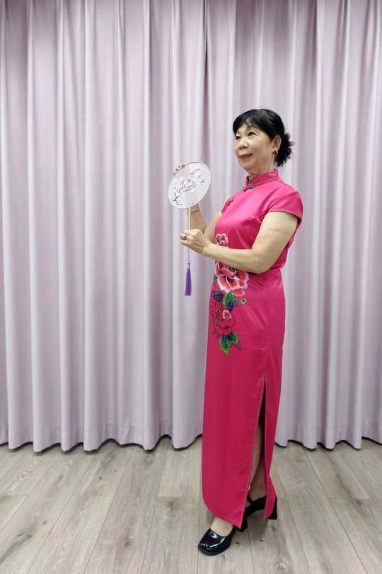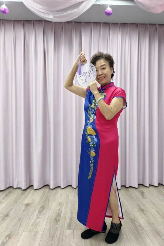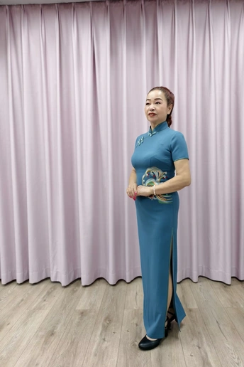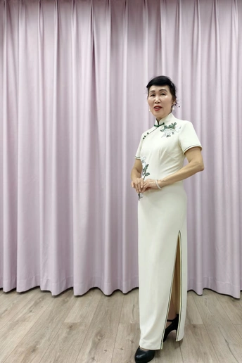 一袭素色旗袍,绣着清雅花纹,开衩处藏着东方韵味。她站在淡紫帘前,眉眼间是岁月沉淀的从容,仿佛把旧时光穿在身上,每一寸都流淌着古典的美,诉说着不疾不徐的故事 。