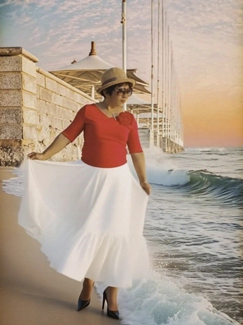 在那片温柔的海边,时光仿佛也放慢了脚步。一位身着红衫白裙的女子,亭亭玉立地站在沙滩上。她轻提裙摆,似与海风共舞,又似在与大海诉说着秘密。远处的遮阳伞在海浪的低吟中静静伫立,像是守护着这份独属于海边的浪漫。这一刻,海的辽阔与她的柔美相互交织,构成了一幅令人心动的画卷,让人沉醉其中,不舍离去。