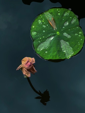 在济南大明湖,拍摄了大雨后湖中的枯荷和荷叶,表现枯萎与生命力的对比及冷暖色彩的对比。