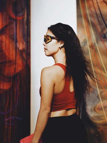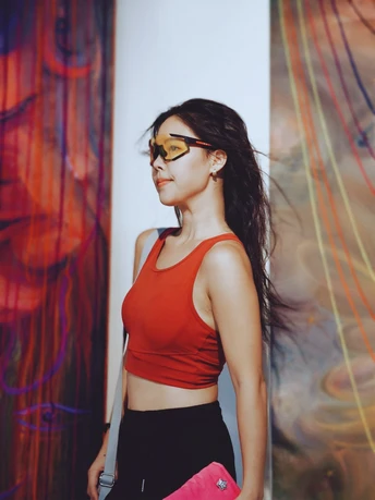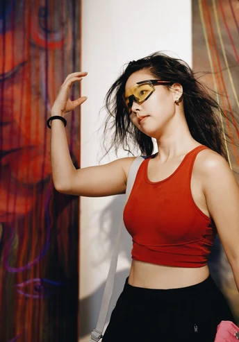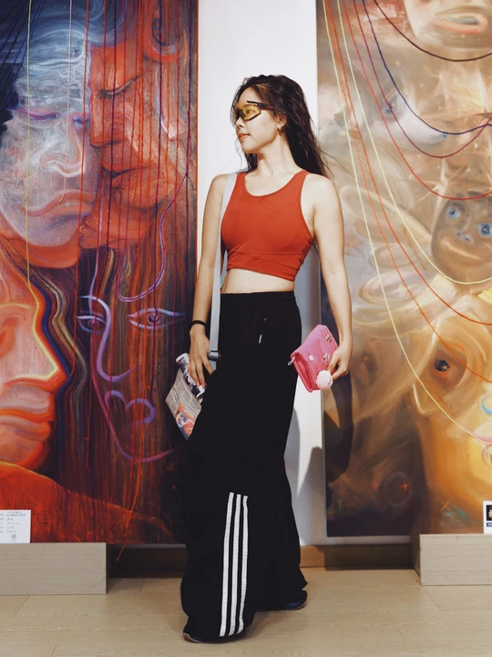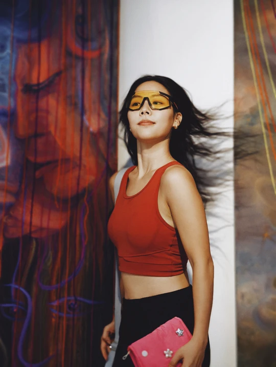 镜头捕捉瞬间, 红背心点燃视觉焦点, 黄墨镜藏着不羁灵魂。 发丝随思绪飞扬, 在艺术背景前, 每一次定格, 都是我与世界的美学对话, 把平凡日常, 拍成独属于自己的文艺故事 。