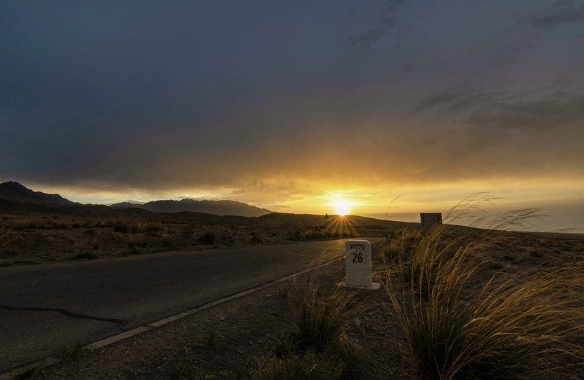 旅行中拍摄到甘肃高台县黄昏时分的壮丽景色。画面中,夕阳的余晖洒在古老的丝绸之路上,为这片土地披上了一层金色的纱衣。道路旁的里程碑,不仅是地理的标记,更是历史的见证者,它默默诉说着千百年来丝绸之路上的繁华与变迁。远处的山峦在夕阳的映照下,轮廓更加清晰,仿佛是大自然用它的画笔勾勒出的壮丽画卷。近处的草丛在微风中轻轻摇曳,似乎在为这美丽的景色伴舞。整个画面充满了宁静与祥和,让人感受到了丝绸之路的历史厚重与自然之美。这不仅是一幅美丽的自然风光照,更是对丝绸之路文化的一次致敬与传承。