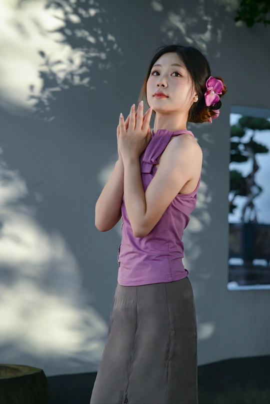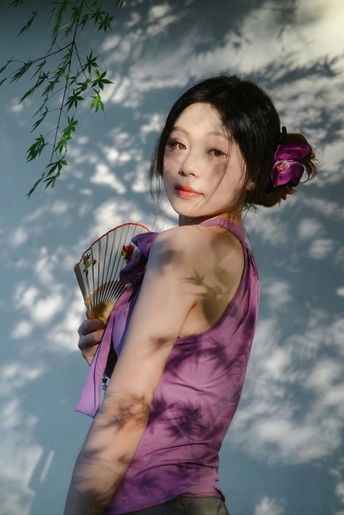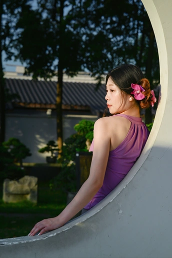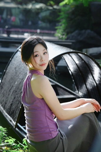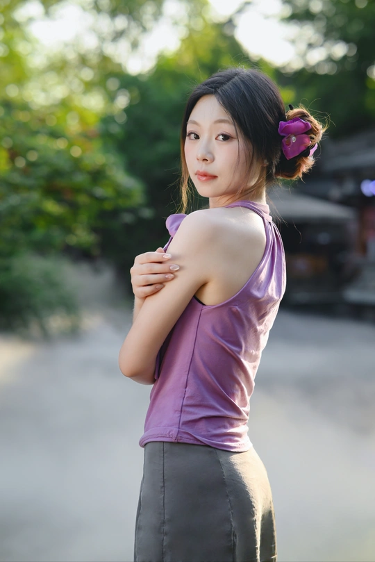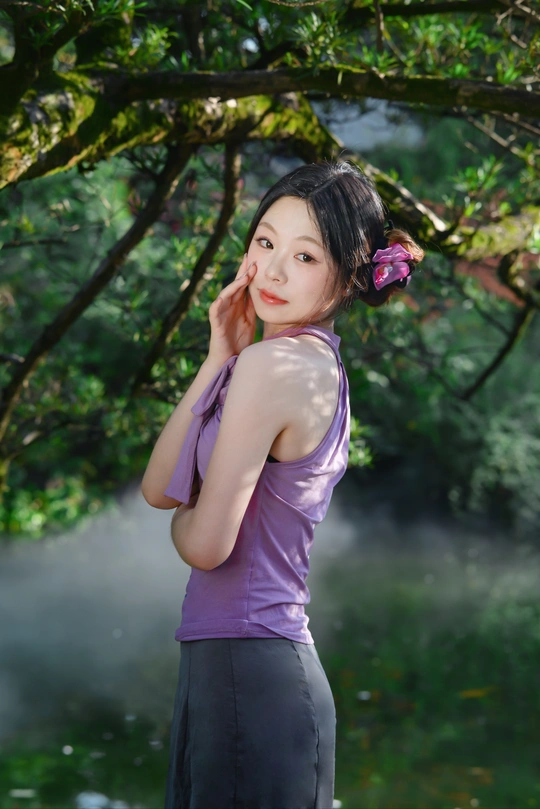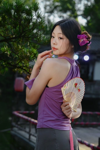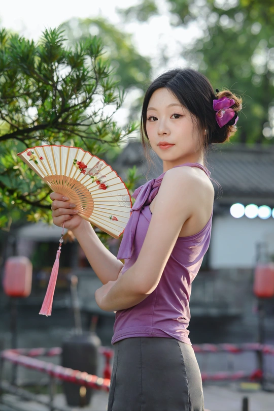 ——最当代的剪影, 正教最老的园林说情话💌 你从乌篷船的韵脚里起身 紫绸肩带滑落湖水的平仄 扇底草莓兔咬破黄昏 将粉红流苏系在晚风的尾音上🎵 白墙是摊开的宣纸 而你回眸时 珍珠耳坠接住的夕阳 正把整个易园 翻译成一本有声的《闲情偶寄》📖 那些被雾汽洇湿的 石板上的雾涌 是未盖钤印的落款 当扇面展开第三折 所有新中式的规则 都开始跟着你的裙摆——叛逃