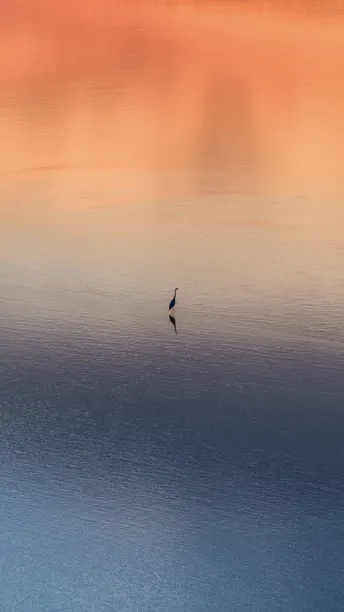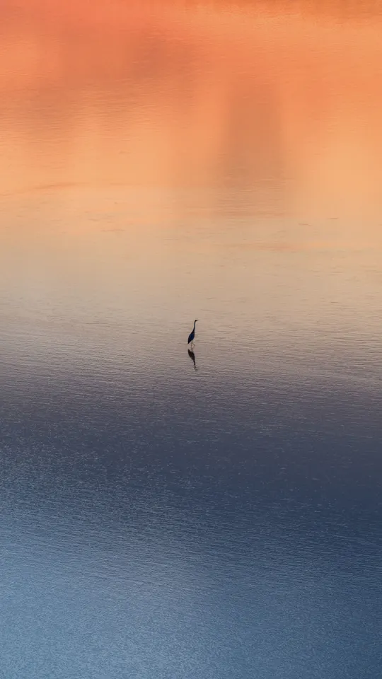 夕阳下的景色让人沉迷,无人机返航过程中发现了一只在夕阳下栖息的夜鹭,感觉画面很宁静,用 6 倍记录下来,回来后把颜色做了一些调整,画面冷暖的渐变,营造出一种宁静且又梦幻的氛围