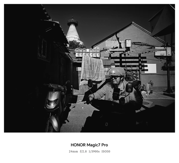 胡同里的光与影 是生活最本真的模样 骑着车的人穿行其中 背后白塔静静伫立 新与旧、动与静 在 Honor Magic7 Pro 的镜头里交融 24mm 焦距捕捉平凡日常 黑白灰晕染出岁月质感 不需要过多修饰 这一瞬的烟火与历史 就足够动人