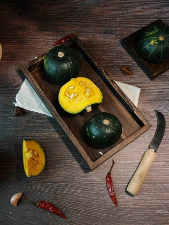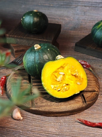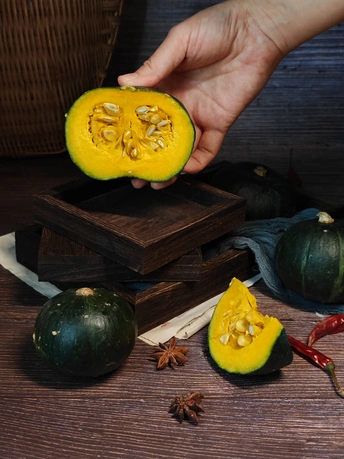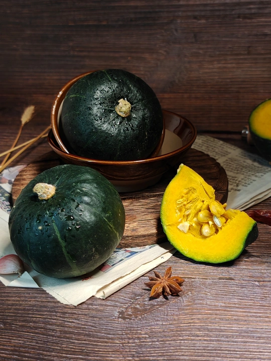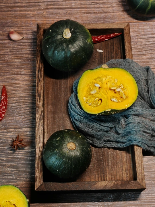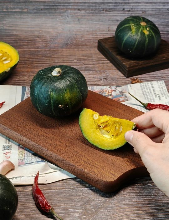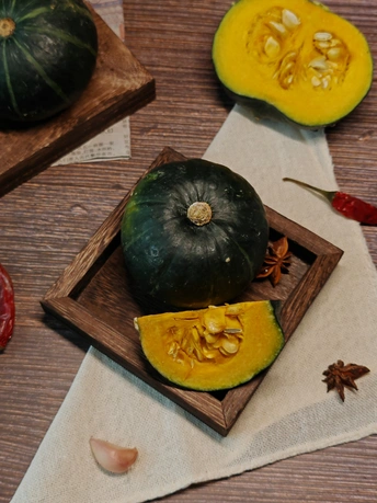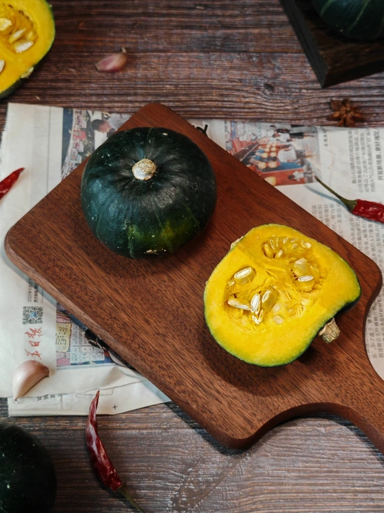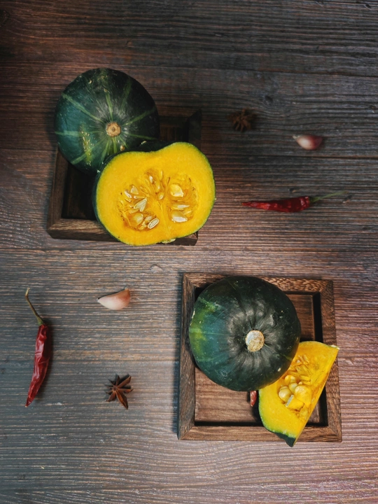 周末赋闲在家,请出家中的贝南瓜。完整的裹着墨绿衣裳,切开的露出金黄瓤,辣椒、八角、蒜作伴,简单摆置,藏着家常的烟火与食材本真的美,待烹饪焕发生香 。