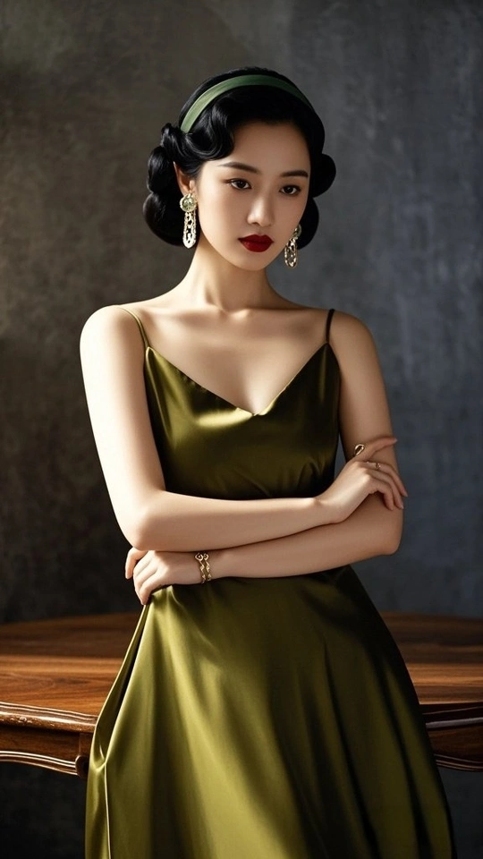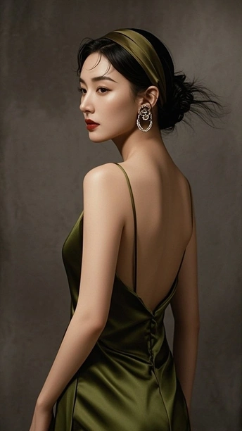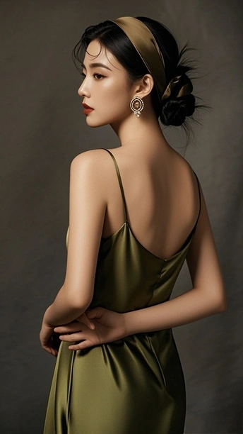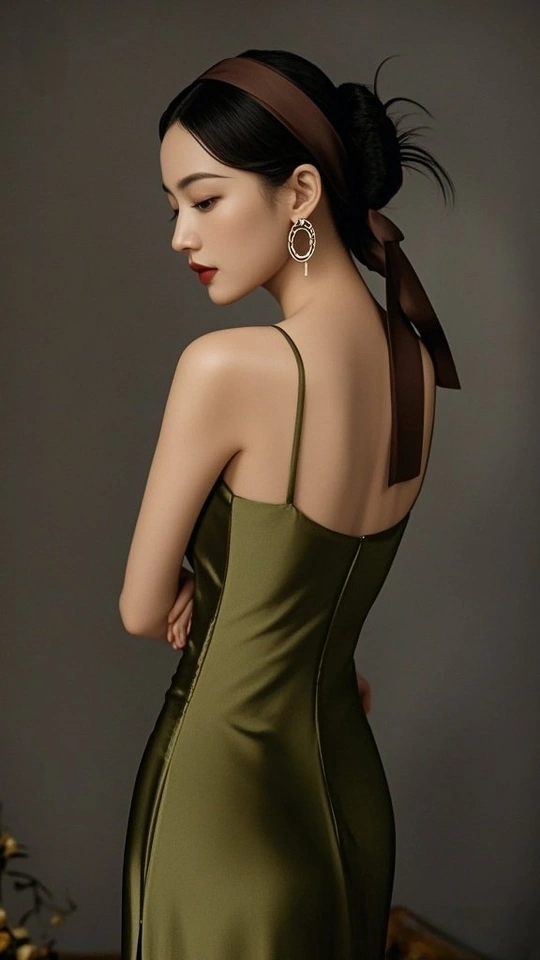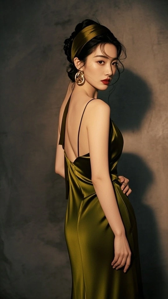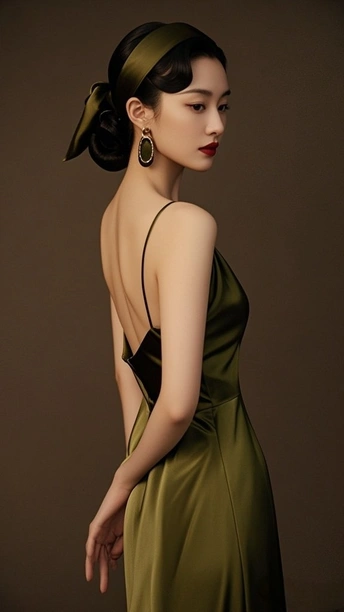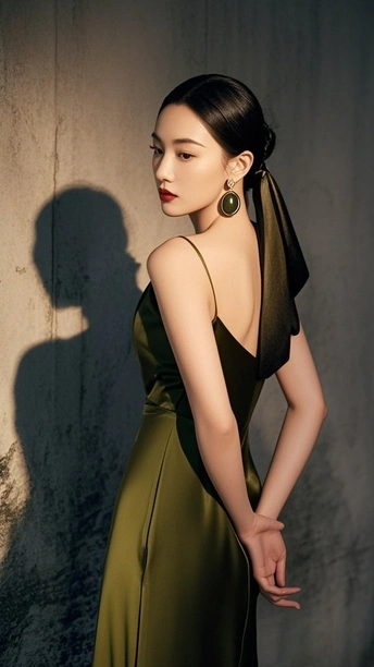 在暗调的幕布前 墨绿的绸缎流淌成河 吊带牵起光的丝带 后背是未写的信笺 发间的缎带 系住风的私语 耳坠轻晃 碰响银色的星 她转身 背影是半阙宋词 在光影里 洇开绸缎的叹息 每一褶褶皱 都藏着夜的谜语 皮肤是月光吻过的潮汐 这具剪影 从时光深处走来 携着墨绿色的静谧 把刹那 站成永恒的诗意