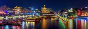 南京夫子庙的夜景,是一幅流动的《南都繁会图》,秦淮河在灯影里铺展开千年文脉与市井繁华的瑰丽长卷。朱红牌坊在金色灯带勾勒下巍然矗立,魁星阁金顶倒影碎玉流金,岸边古建筑的飞檐翘角挂满彩灯,宛如穿越至金陵盛世。