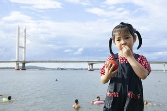 周末带娃去江边,捕捉到了一组超绝的夏日画面! 小朋友穿着红蓝格子上衣搭配背带裙,粉粉的小拖鞋超可爱。她坐在江边台阶上,洗番茄、吃番茄的样子太萌啦! 江水、大桥,还有玩水的人们,构成了一幅超有生活气息的夏日图景。小朋友拿着透明容器玩水、看番茄在水中漂浮,眼里都是好奇和快乐。 宝妈们带娃出门可以试试这样的江边玩法,简单又出片~年轻女孩们也可以来这里拍照,享受夏日的悠闲时光,分分钟拍出氛围感大片! #夏日时光 #遛娃好去处 #江边拍照 #可爱宝宝