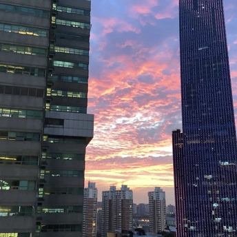 夕阳西下,CBD玻璃幕墙流金,远处社区高楼,火烧云漫天泼彩,归家人步履轻快,城市在温柔暮色中呼吸。