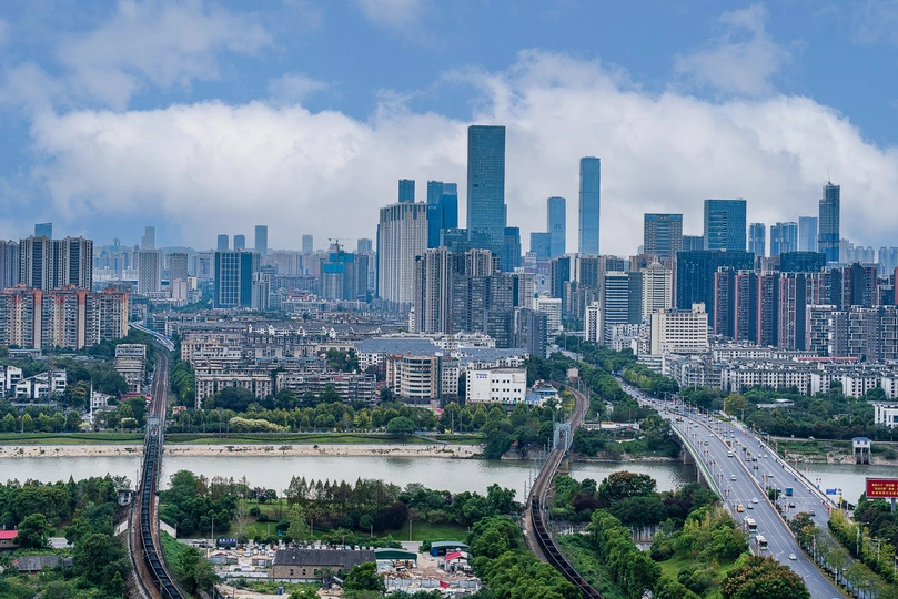 在城市中央,蜿蜒铁路穿行现代楼宇,公路车流如织,与蓝天共绘城市发展画卷。钢铁轨道承载历史,新生建筑拔地而起,见证时代共生共荣的壮阔征程。