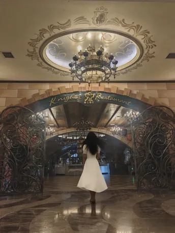 和朋友约在骑士餐厅,一进门就被这氛围拿捏了!复古吊灯、雕花铁门,仿佛穿越到中世纪城堡。我穿着小白裙,大步往里走,感觉下一秒就要开启一场奇妙的美食冒险~期待等会儿的美味,希望别让我这“仪式感”落空,先给自己打个气,今晚要好好享受呀!