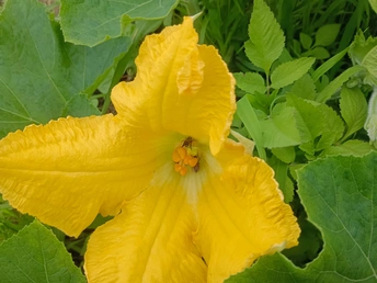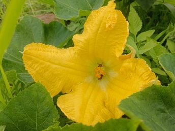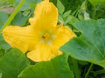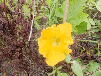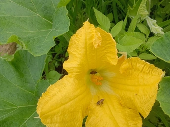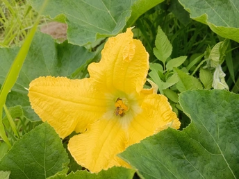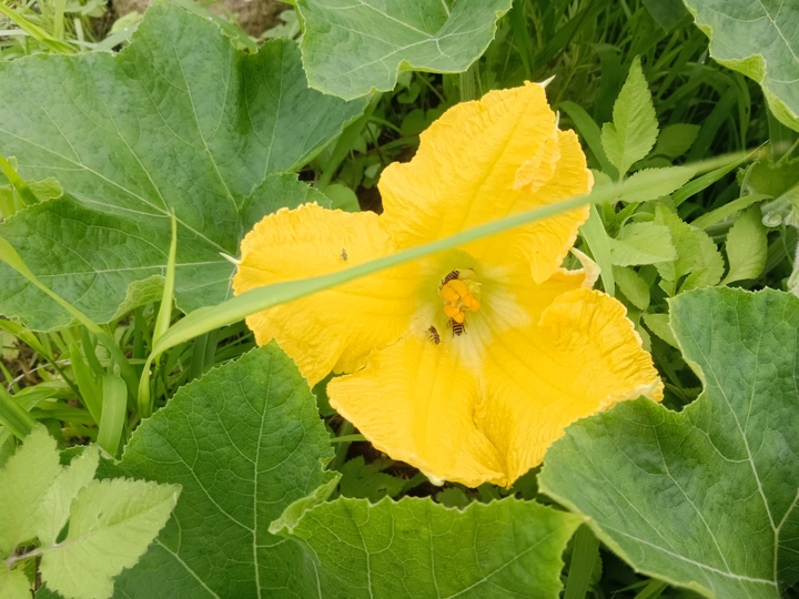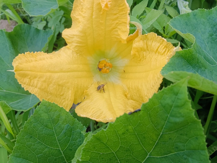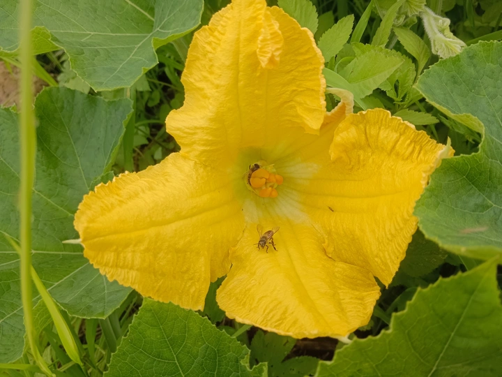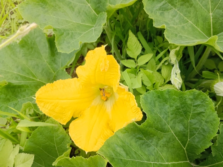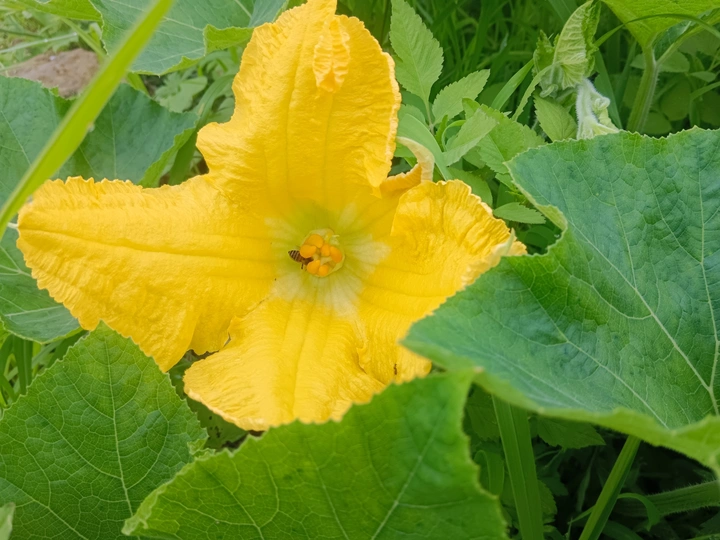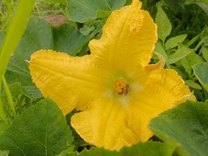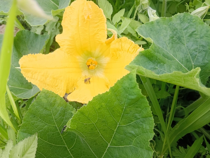 菜园里的微光 午后的菜园浸在暖煦里,我拨开藤蔓,一朵南瓜花骤然亮了眼。 五片花瓣舒展如黄绸,边缘俏皮地卷着边,像被风揉皱的裙摆。花心的橙黄蕊心微微鼓起,藏着清甜的秘密。厚实的绿叶托着它,叶脉如纵横的溪流,淌着生机。叶片下,小黑虫正慢悠悠踱步,似在丈量叶的宽度;蜜蜂忽的落上花瓣,细腿轻颤,搅得花粉簌簌,翅膀振出细碎的嗡鸣,连阳光都跟着泛起金波。 我蹲在泥土地上,看这微小世界里的忙碌与从容。原来平凡的菜园,藏着这般鲜活的景致——每道褶皱的光、每声细微的振翅,都是生命在低语。自然从不用宏大喧哗,只需一朵花、一只虫,便把生机泼洒得淋漓尽致,教我懂得:静下心,平凡处亦有璀璨微光。