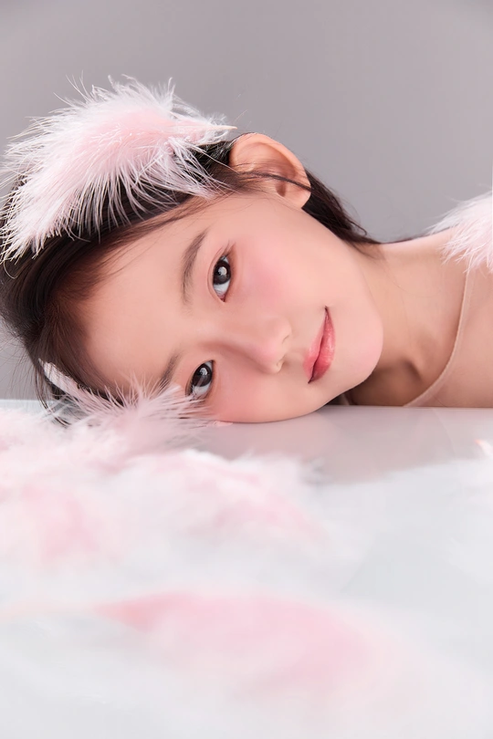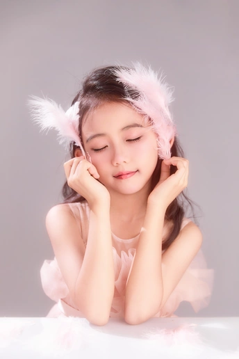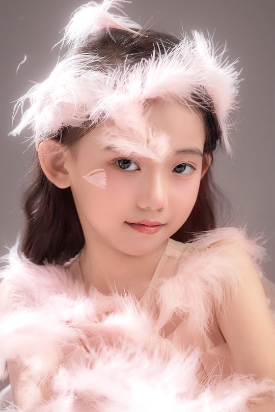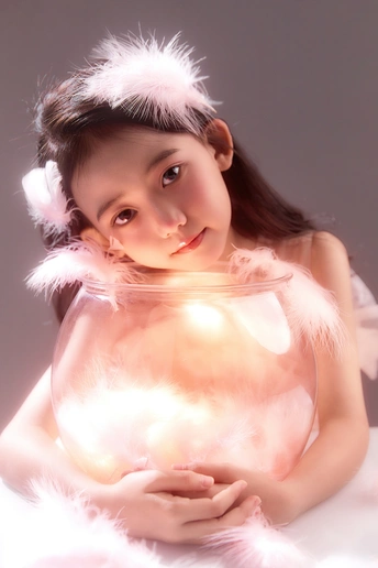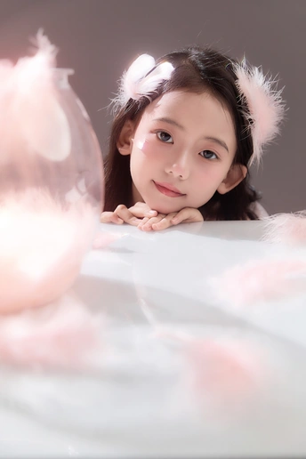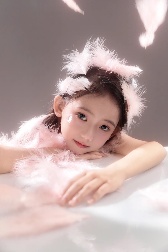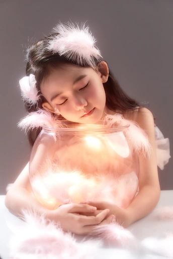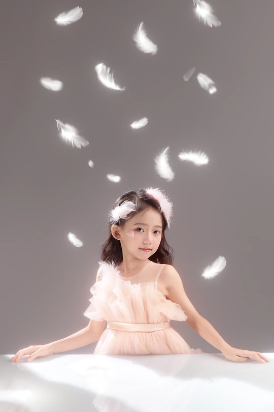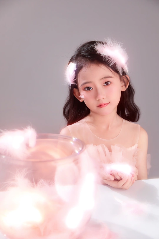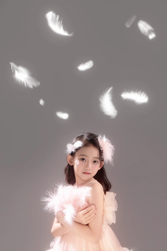 呈现出一种梦幻般的氛围,小女孩仿佛落入凡间的天使,非常可爱。色彩方面,整体色调柔和,以粉色和白色为主,营造出纯洁美好的感觉。