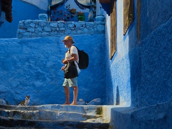 阳光斜斜的洒在舍夫沙万的街角,把蓝色的梦照亮。旅人悠悠踱步,像是怕吵醒这静谧之境。小猫傲娇的蹲坐石阶,本喵才不屑与人类打卡,这是我的舞台,任尔来去,我自稳坐此地。人和猫,各有各的惬意,共织这蓝色小城的温柔梦境。
