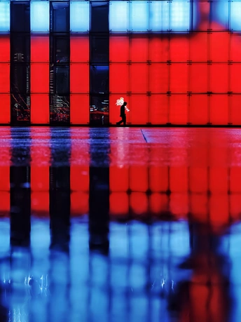 在光影交错的夜色中,一位过客悄然走过红蓝撞色的建筑墙前。墙壁红得热烈,似燃烧的火焰,又似澎湃的内心;蓝则深邃宁静,如沉沉夜空,又如幽深海洋。地面的积水恰似一面天然的镜子,将这斑斓色彩与行人身影一并收入,虚实相间,构成一幅极具艺术感染力的画面。