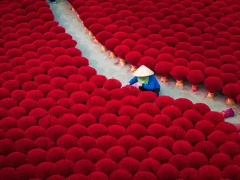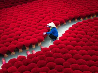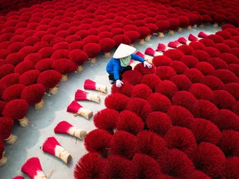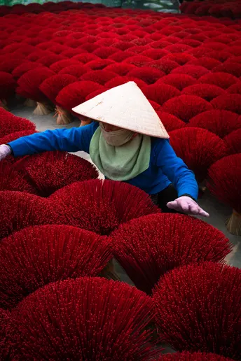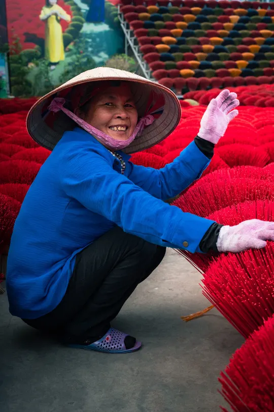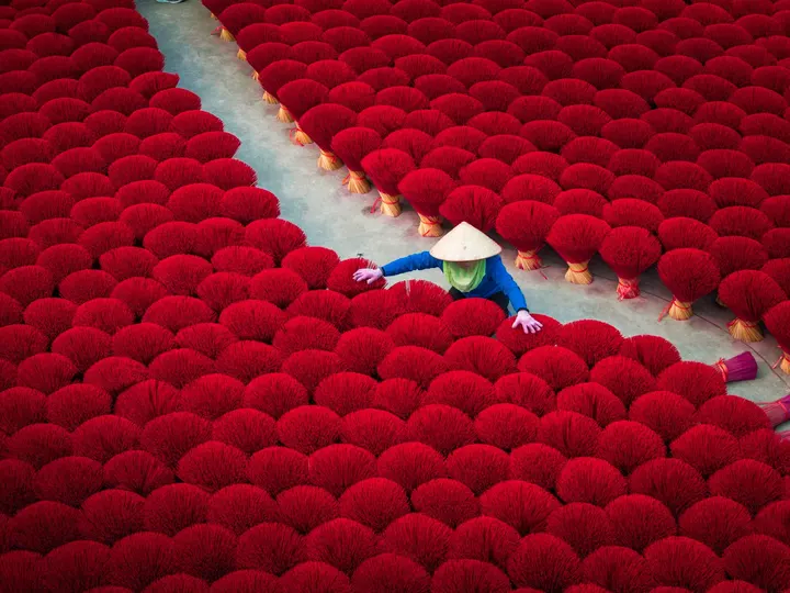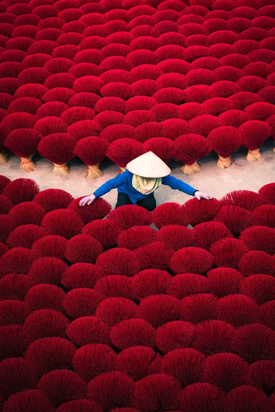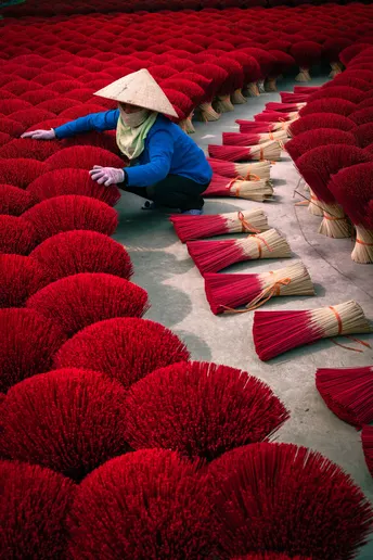 河内制香村:镜头背后的红与汗 在河内制香村,红得发烫的香束里,藏着比画面更沉的故事。 清晨六点,天还没亮透,制香工人阿婶就戴着斗笠往晒场赶。她得趁着日头没毒起来,把成捆的香搬出来晾晒。这些红香看着鲜亮,实则娇气,晒久了会褪色,晒短了干不透,全靠经验拿捏。 拍照时,游客总爱追着问“怎么摆好看”,阿婶就配合着蹲下、整理、笑,可镜头没拍到的,是她被香粉染成红指甲的手,是腰弯久了直起来时的轻颤。旺季时,她一天要经手上千捆香,红香堆里打转,衣服被汗水洇出盐花,却还要在镜头前保持最好的状态——因为这是游客眼里“越南味”的一部分,也是她养活家人的营生。 那些网红照片里,红香是浪漫背景,可对阿婶们来说,这是祖祖辈辈传下的活计。她们不懂“出片”“流量”,只知道每一根香晒好、捆好,能换来孩子的学费、家里的米钱。我们镜头对准的“诗意”,不过是她们再普通不过的日常,红香如海,浪潮里全是生活的重量。 当我们为照片里的“越南风情”惊叹时,别忘了这红浪背后,是一个个像阿婶这样的人,用重复的劳作,把传统熬成生活的底色 。