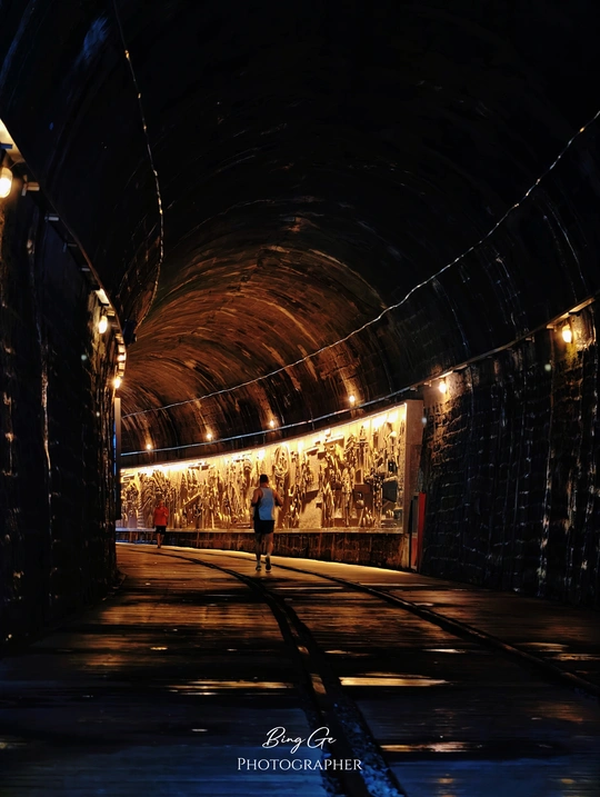 漫步厦门铁路公园,穿越百年时光的鸿山隧道正敞开怀抱等你来!这条700米长的老隧道,曾是1956年建成的鹰厦铁路“先锋”,蒸汽火车的轰鸣声在这里回荡了半个世纪。如今斑驳铁轨化作红砖步道,墙面上跃动着3D浮雕——北端刻着铁道兵挥汗开山的豪情,南端飞驰着现代高铁的剪影,一走一过间,仿佛穿越了70年风云。