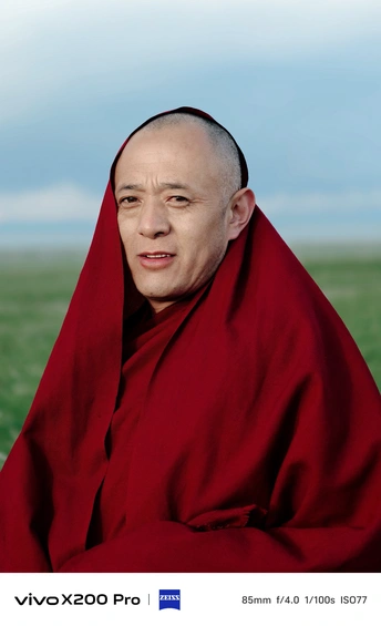 草原为幕,他身披红袍静立。岁月刻痕的面容,藏着修行路上的执着,是人文与信仰交织的生动注脚 。