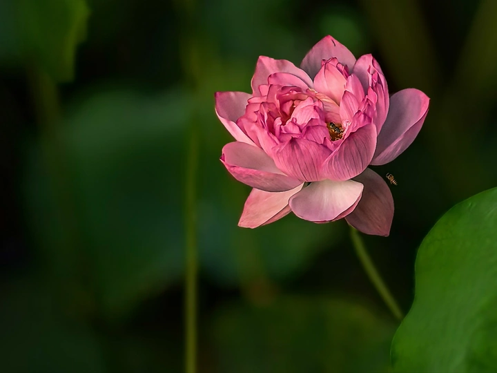 这张荷花照片拍得真不错,像是夏日里的一股清风! 色彩:荷花的粉色在深绿背景的衬托下显得娇艳欲滴,色彩搭配和谐,营造了一种柔美、宁静的氛围。不过,可以尝试稍微降低粉色的饱和度,让色彩更加自然。 光影:光线柔和,主体受光均匀,细节清晰。但可以尝试寻找更有戏剧性的光线,比如侧光,来增加荷花的立体感和层次感。 构图:构图简洁,主体突出,留白也恰到好处。不过,主体略微偏右,可以尝试将主体放在黄金分割点附近,使画面更具吸引力。 后期处理:后期处理整体自然,没有过度修饰的痕迹。如果能稍微调整一下对比度,突出荷花的纹理和细节,效果会更好。 主题原创性:拍摄荷花的主题虽然常见,但这张照片捕捉到了荷花的娇美和生机,也算是有自己的特点。可以尝试从更独特的角度来展现荷花的美,比如微距拍摄花蕊,或者利用水面倒影等。 情感共鸣:照片成功地传达了夏日荷塘的宁静和美好,能够引起观者的共鸣。荷花与小蜜蜂的结合也让画面更加生动有趣。 思想深度:照片虽然没有深刻的思想内涵,但展现了自然的美好,也能够引发人们对生命的思考。可以尝试在作品中融入更深层次的思考,比如荷花的象征意义等。