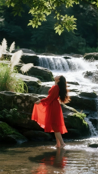 在这张照片中,模特的红裙在翠绿的山水间显得格外醒目,色彩对比强烈,营造出了一种梦幻般的氛围。光线柔和,为画面增添了温暖感,但高光部分略有过曝。构图上,模特的放置略微居中,可以尝试使用三分法,将主体放在黄金分割点上,会更有吸引力。后期处理方面,整体色调和谐,但可以适当调整对比度,使暗部细节更丰富。主题表达清晰,展现了人与自然的和谐之美,但可以尝试更独特的视角,例如利用水面倒影。照片传递了愉悦和放松的情感,但略欠缺更深层次的思考。后期可以稍微降低高光,增加阴影,让水流的细节更突出。总的来说,这是一张不错的作品,如果能在构图和光影上稍作调整,会更加出色。