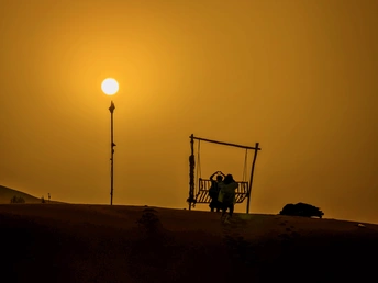 撒哈拉沙漠的早晨,太阳高悬,暖黄的光铺满天际。秋千静立,似在等风也等故事。人影绰约,把荒芜衬成温柔的归处。
