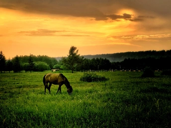 黑龙江省漠河市北极村,夕阳西下之时,一匹马在郁郁葱葱的草地上,静静地独自享受着美餐,从另外一个方面彰显了生态环境和人文环境的优良。
