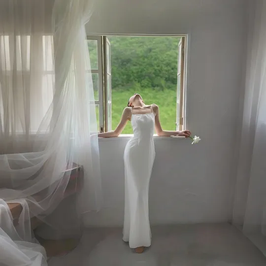 在白与绿的交界 她把自己 站成一道 透明的虹 白纱漫过臂弯 像未写完的梦 轻晃 窗外的风 撞碎在 她仰起的脖颈 那朵花 悬停在指尖 是整个春天 遗落的 一颗 柔软的星 而她 以身体为桥 连通室内的静 与远山 无尽的青