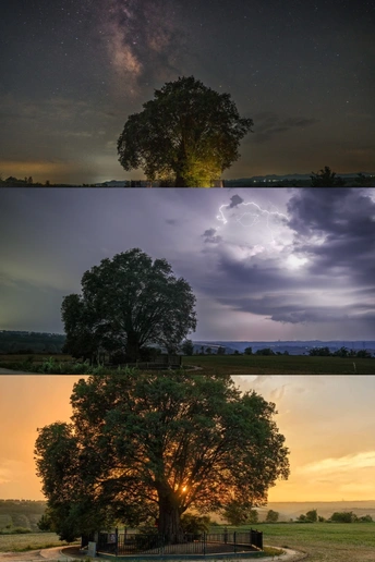 闪电+星轨+火烧云:一棵树的三种极端天气