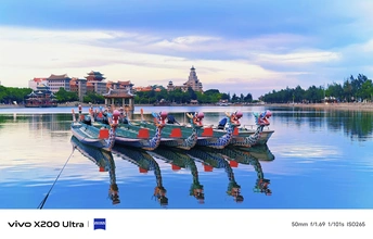 暮色浸染龙舟池,三三两两的龙舟斜倚波光,船影在涟漪中漾开陈年旧事。对岸的嘉庚建筑群披着橘粉天光,飞檐翘角刺破流云,红砖廊柱倒映池中,与龙舟的斑斓彩绘交叠成闽南的斑斓长卷。白鹭掠过暮色四合的天际,惊起一池碎金,恍然听见当年学村的钟声与鼓点,在六月温热的风里轻轻摇晃。