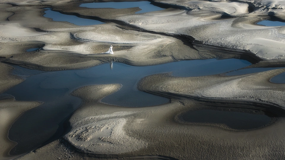 武汉的天兴洲每逢枯水季水位下降,会露出大片大片的滩涂和水坑,我有幸捕捉到了一位白衣女子在滩涂漫步,通过后期调色让整个画面更加幽静神秘
