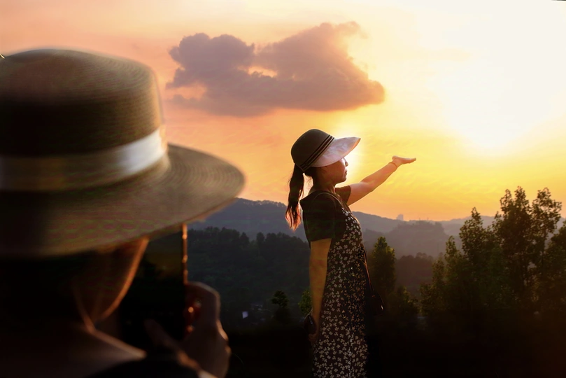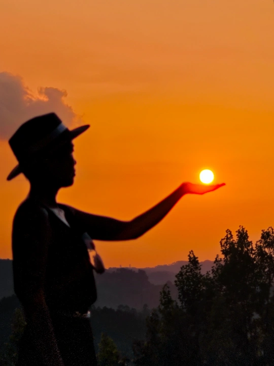 夕阳西沉,我以掌心为舟,打捞一整个橘色黄昏。山影作陪,云朵让路,这颗落日,是天地递来的温柔礼物,攥在手里,便握住了今日份的小确幸 。