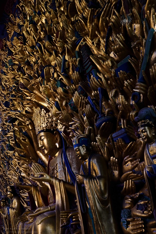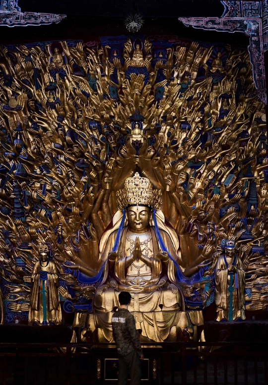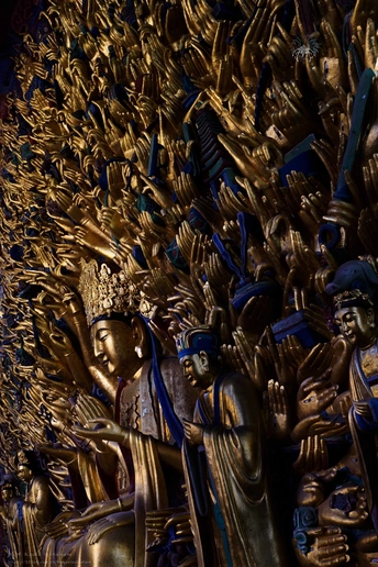 2014年去大足的时候留下最大的遗憾是没有见到千手观音,那时候千手观音封闭维修了近八年时间,也是在那次维修过程中发现了藏在佛像中的暗格和里面的宝物。这回一来到大足就直奔千手千眼观音。 开凿于南宋(1179—1252年),由高僧赵智凤历时70余年主持营建宝顶山石刻群时雕琢。 面积88平方米,是我国现存最大的集雕刻、贴金、彩绘于一体的摩崖石刻造像。 经2008—2015年修复工程通过高科技手段精确计数,确认共有830只手,每只手掌刻一眼,持一件法器(修复前民间传说为1007只)。构图设计以主尊观音为中心,千手呈辐射状展开,布局如“孔雀开屏”,层叠错落,远观似金色浪潮,近观每只手姿态各异,无一雷同。 手姿变化或伸或屈、或拈或托,手指屈伸离合极尽动态,兼具力度与柔美。作家汪曾祺赞其“富于人性的手”。 手持法器涵盖佛经典籍记载的40余种(如宝戟、化宫殿、葡萄手),更融入宋代世俗生活元素(如食盒、毛笔、经册),生动反映南宋社会风貌。梁思成称宝顶山卧佛为“国内首选”,千手观音亦属同期杰作。