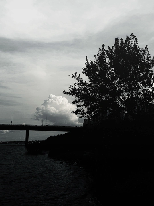 这张引人注目的黑白照片捕捉到了黄昏或黎明时分河边的宁静景象。一座桥梁横跨水面,连接着两边的景观,一朵蓬松的大云朵占据了天空。树木和远处的建筑轮廓为画面增添了深度,营造出宁静而又戏剧性的氛围。平静的水面反射出柔和的色调,进一步增强了图片整体的平静氛围。