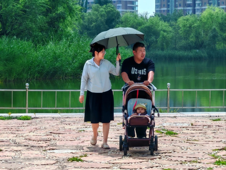 夏日周末,呼和浩特市锡林公园,一对年轻夫妻在推着儿童车陪伴宝贝乘凉休闲。