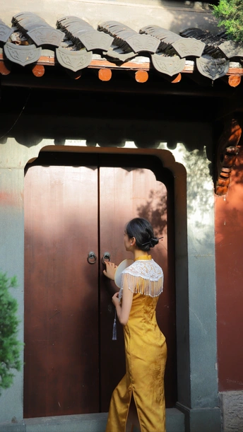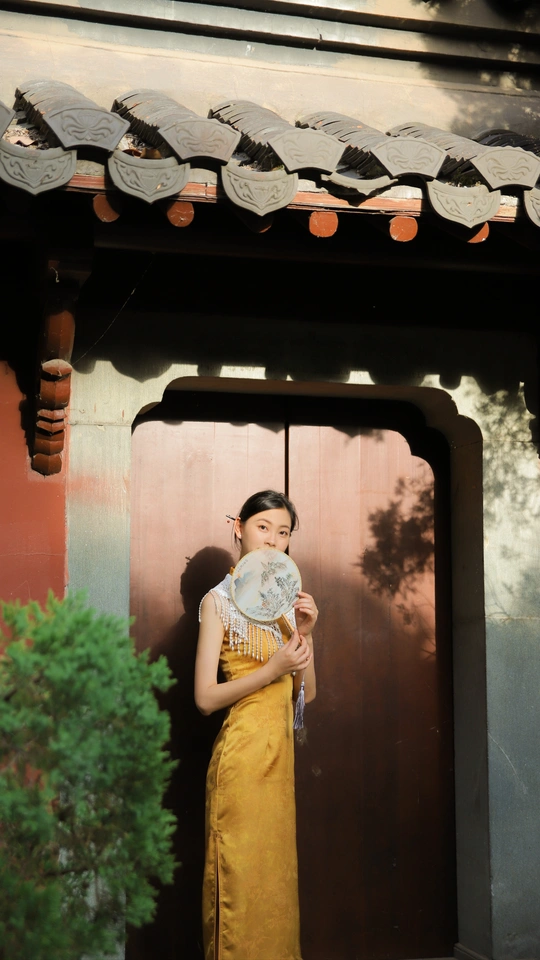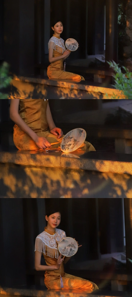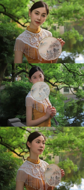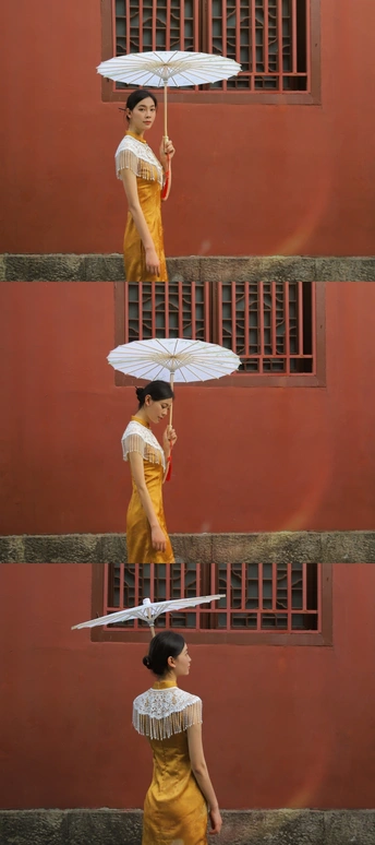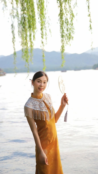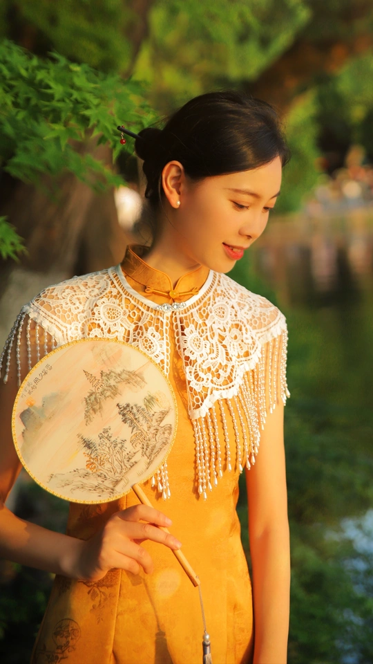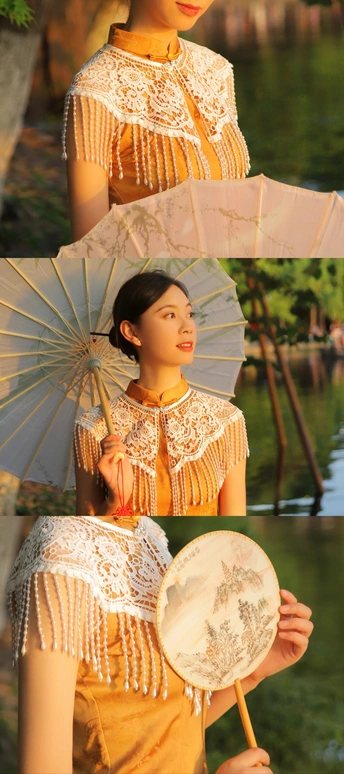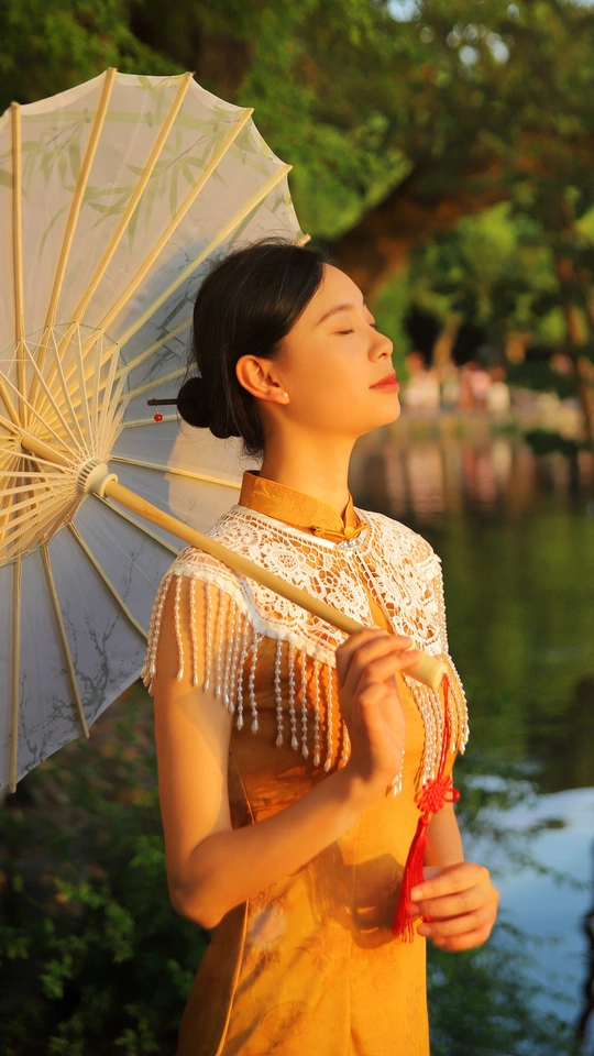 黄昏湖畔,旗袍配流苏云肩,油纸伞斜倚,光影里藏着旧时光的温婉
