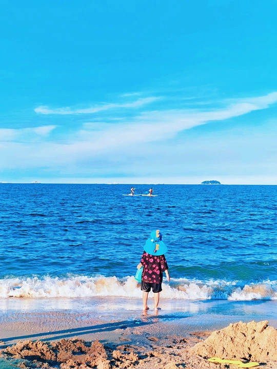 小朋友在海滩上挖出了自己梦想的乐园,转身跑去海边取水。看见远处的海面上划船游玩的人们于是停下了脚步默默地驻足观看。也许他也在畅想这样的自由,也许他在好奇这个精彩的世界~