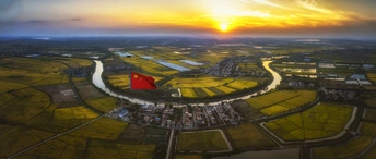 金黄田野如大地织就的丰收锦缎,河流蜿蜒似灵动丝带,串联起错落村庄 。鲜艳五星红旗高悬,在丰收图景中格外夺目,将丰收的富足与家国的欢庆交融,尽显国泰民安的祥和与振奋。