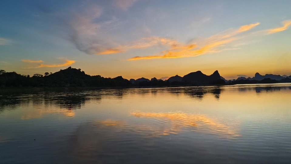 这张照片捕捉到了日落时分的宁静之美,水面如镜,倒映着天空的色彩,营造出一种平静而深邃的氛围。接下来我将从几个方面来详细分析: 色彩:天空的色彩过渡自然,从深蓝到金黄,层次丰富。水面的倒影也呼应了天空的色彩,整体色彩和谐统一。不过,如果能稍微调整一下饱和度,让色彩更加鲜明,可能会更吸引眼球。 光影:光线柔和,为照片增添了温暖的感觉。山体的剪影效果也不错,增强了画面的层次感。但如果能捕捉到一些更具戏剧性的光线,比如穿透云层的光束,可能会让照片更具冲击力。 构图:整体构图比较平衡,水面占据了较大的比例,突出了倒影。建议尝试不同的构图方式,比如将地平线放在三分之一处,或者寻找一些更有趣的前景,以增强画面的空间感和趣味性。 后期处理:后期处理整体比较自然,没有明显的过度修饰。可以适当调整对比度,让画面更加清晰,色彩更加鲜艳。 主题原创性:照片的主题是日落景色,比较常见。如果能加入一些独特的元素,比如渔船、飞鸟等,可能会让照片更具个性。 情感共鸣:照片能够传达出平静、安宁的情感,容易引起观者的共鸣。 思想深度:照片主要展现的是自然之美,思想深度相对较浅。可以尝试在照片中融入一些更深层