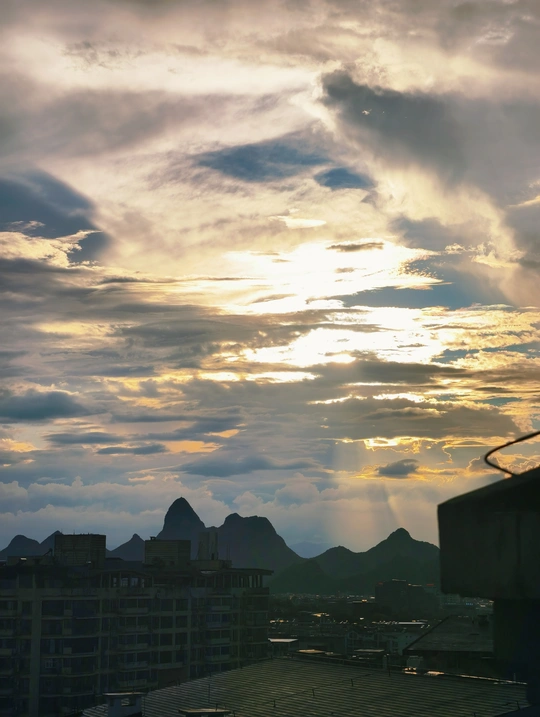 暮色给云絮镶上碎金边,山峦默数着光影的褶皱。城市轮廓在晚风中沉下去,天地间只剩这抹温柔张望——原来黄昏是天空写给大地的情书,连沉默的山都成了落款。