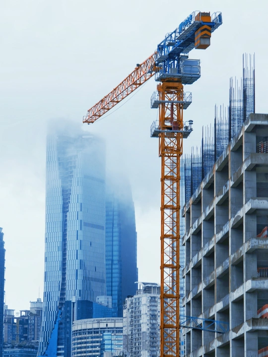 烟雨笼罩天际, 摩天楼映着朦胧, 塔吊臂展如铁翼, 在建楼体筋骨初成, 新与旧,成与长, 共绘城市的诗行。