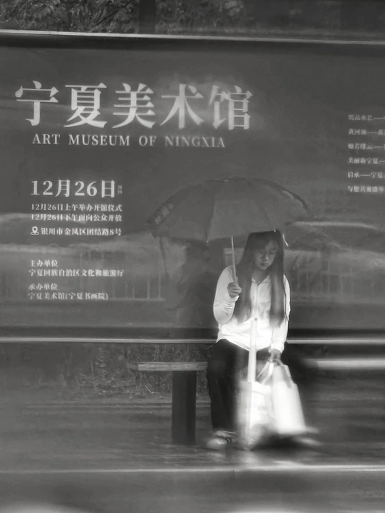 宁夏美术馆的海报前,雨幕中的她,似是艺术与日常的接点,伞撑起的小世界,藏着对美的悄然向往 。