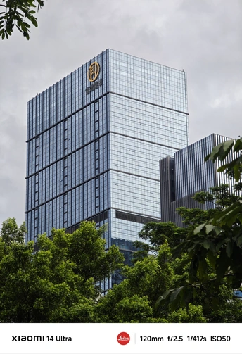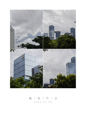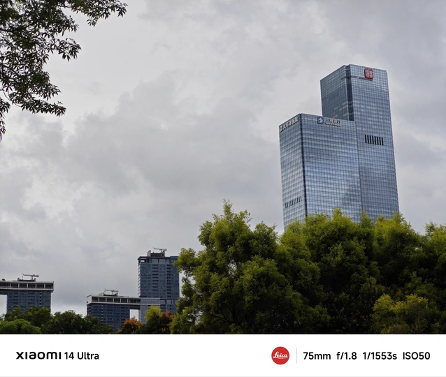 灰蒙天空下,玻璃幕墙的建筑与葱郁绿树相映,现代都市的硬朗线条,融入自然的柔和生机,勾勒出城市独特的生态轮廓 。